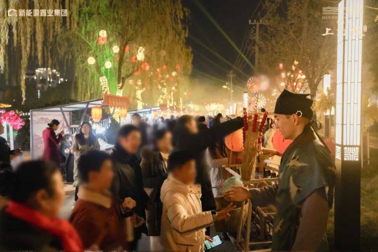 还有热闹的宋风市集,河中游船不时经过,岸上人群熙攘,与穿着宋代传统服饰的演员擦肩而过,瞬间有种穿越进宋画的感觉,颇为富贵迷人眼。