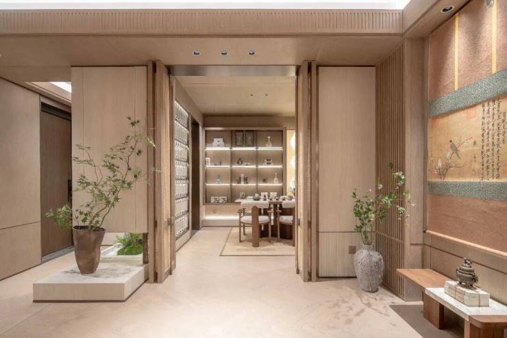 这个户型并没有选用传统的宽厅设计,而是加入中式人居的元素,将客厅一部分抬高,连通南向次卧,打造一个中式禅意空间,可以作为书房、茶室、冥想空间,充满了宋代生活的风雅与闲适感。
