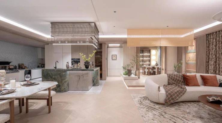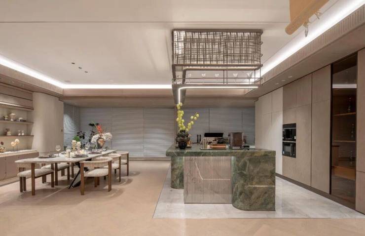 客厅、餐厅、厨房、茶室一体化设计,家庭互动、会客聚餐都可以在这里进行,你可以想象出非常多的运用场景。