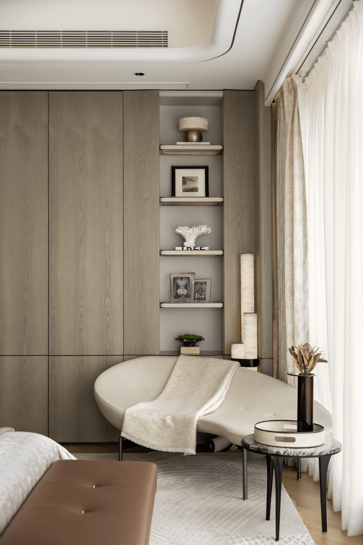 主卧延续了以米白和粽色为主的基调,打造出高级舒适的休憩之所。精炼的设计呈现出优雅整洁,简约而奢华的现代美感,在静谧之域中,安放生活的自在与柔软。