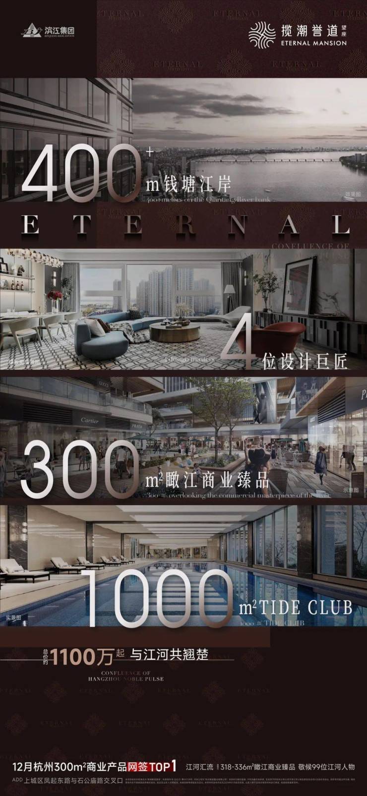 滨江集团 江河汇流 大师级当代东方艺术约300㎡平层作品,聘请广州GBD设计创始人杜文彪先生、李益中先生担纲主创,占地面积约2.3万㎡,园林面积约6300㎡,容积率3,标准层高3.5米,总套数99户,户型318㎡、336㎡,总价999万起,高奢精装交付!