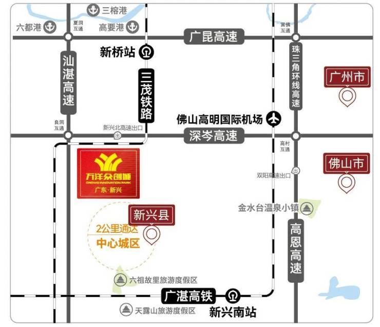 广东(新兴)万洋众创城位于粤西中枢,东南临佛山、江门相邻,东北依肇庆,西南与阳江相连,周边集铁路、高速公路、高铁多交通功能于一体,路网四通八达,区位优势明显,大大减少运输成本。