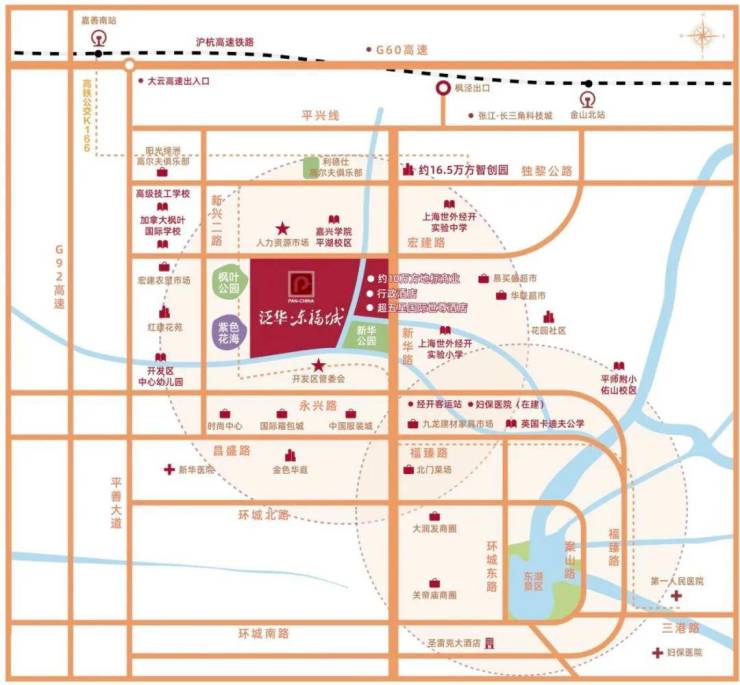 平湖泛华·东福城项目东临新华北路主干道,北临宏建路,北侧为嘉兴学院平湖校区,南侧是天然乌沙漾与公园绿地,环境优美。距离市中心大润发商圈、关帝庙商城约3公里车程,交通便利。