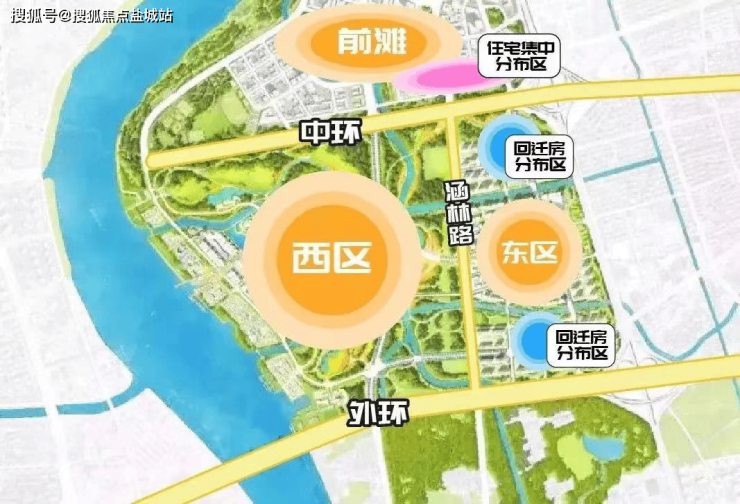 而前滩南滨江是紧贴着前滩的南面,二者的分界线就是中环路的道路中心线,是真正的“0”距离。