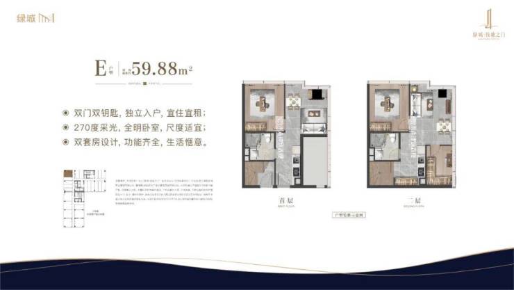 建筑面积约34-59㎡双钥匙公馆,买一层享两层,双倍空间,灵活多变,满足居住、办公、投资等多重需求,是杭州难寻的60万以下小户资产,且为实景准现房,小投入回报快,明星产品价值显著。