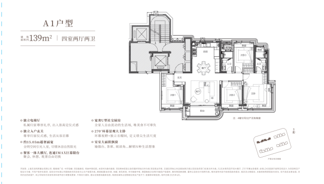 建面约139㎡4房户型,套数不多,但产品力绝对惊艳。四开间朝南,约15.05米宽的南向横厅、约1.6米进深的奢阔阳台,中环顶级享受的既视感。主卧约4.45米的进深,约4米大面宽(含飘窗),配合270°转角飘窗,是目前市面上产品力高配的户型之一,值得一冲!