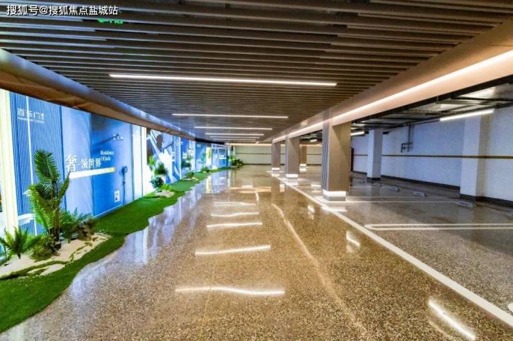 再将目光聚焦到一般项目容易忽视的地库空间。明亮阔绰的地库空间内,顶部以咖色格栅及吊顶光源重塑空间层次感,与之相对应的是在灯光下熠熠生辉的彩石地坪。
