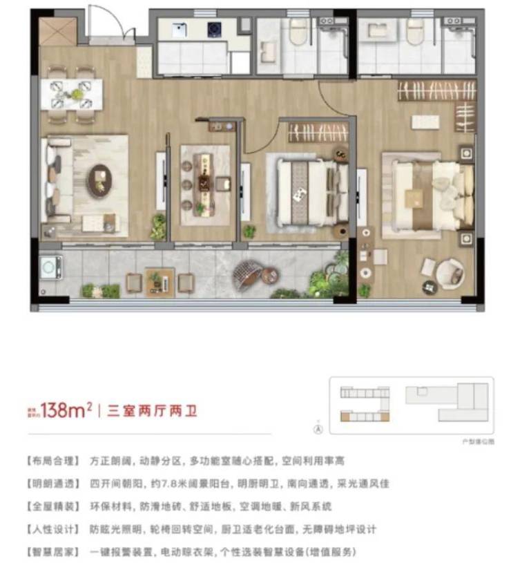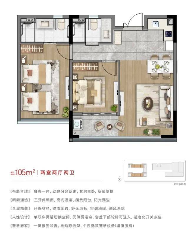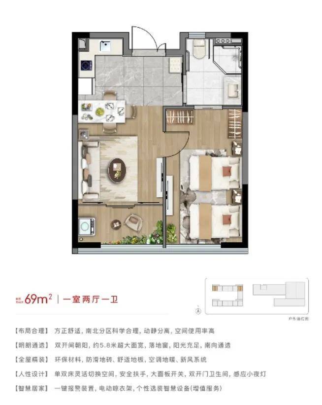 •产权居家养老公寓,医康养融合保障,户型全朝南、大面落地窗设计,恒温恒氧空间,室内紧急报警装置,突发情况紧急救治。
