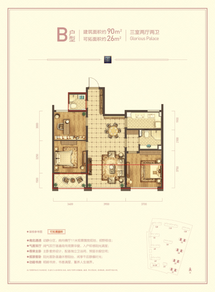 建筑面积约130㎡, 功能上可以说是自住一步到位的上佳选择。餐厨比邻,动线合理; 近20㎡主卧,私享衣帽间、独立卫浴、景观飘窗;北向独立书房,可创变为游戏房、茶室、儿童房等,拓展生活N重可能。 张弛有度的背后金城 路、地铁旁活力住区,机遇当前,敬请把握。