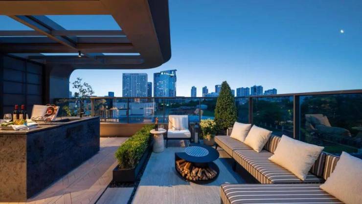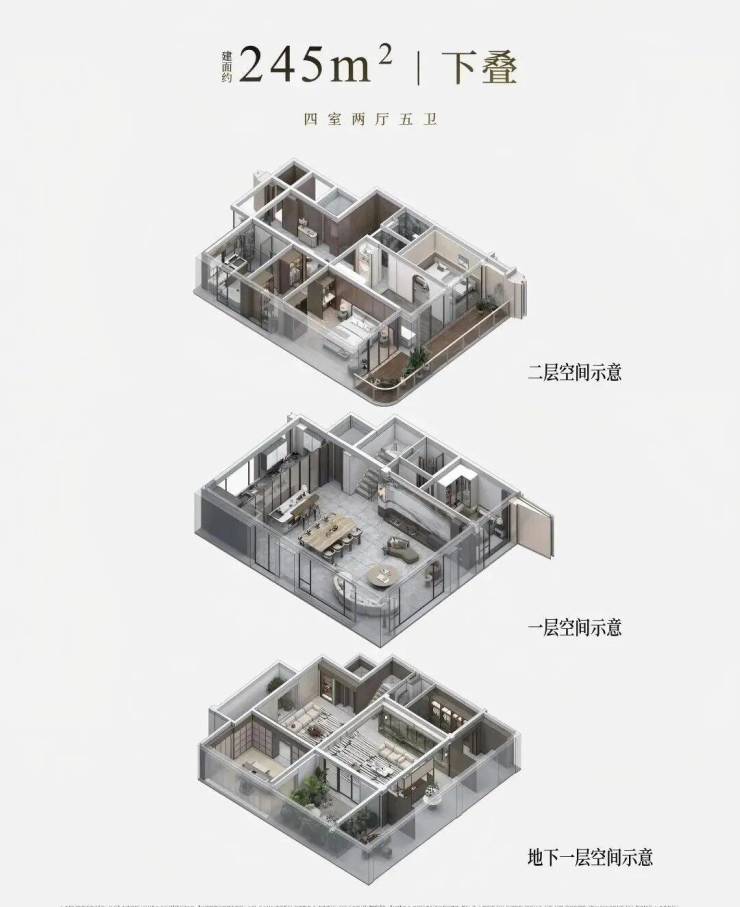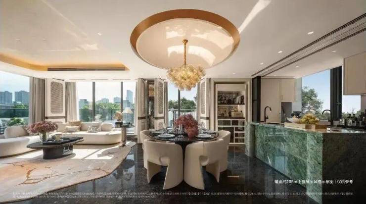 让空间更多地向风景打开,且与当代家庭的日常栖居结合,每一层都勾勒出独特的生活场景。边套约10.2m的开间,L形露台设计,勾勒270°景观视野。三楼卧室层的私密优雅、四楼餐客厅层的社交开阔、五楼的云端闲逸,上下之间,雍享天地,构筑一个兼具仪式感与舒适度的理想居所。