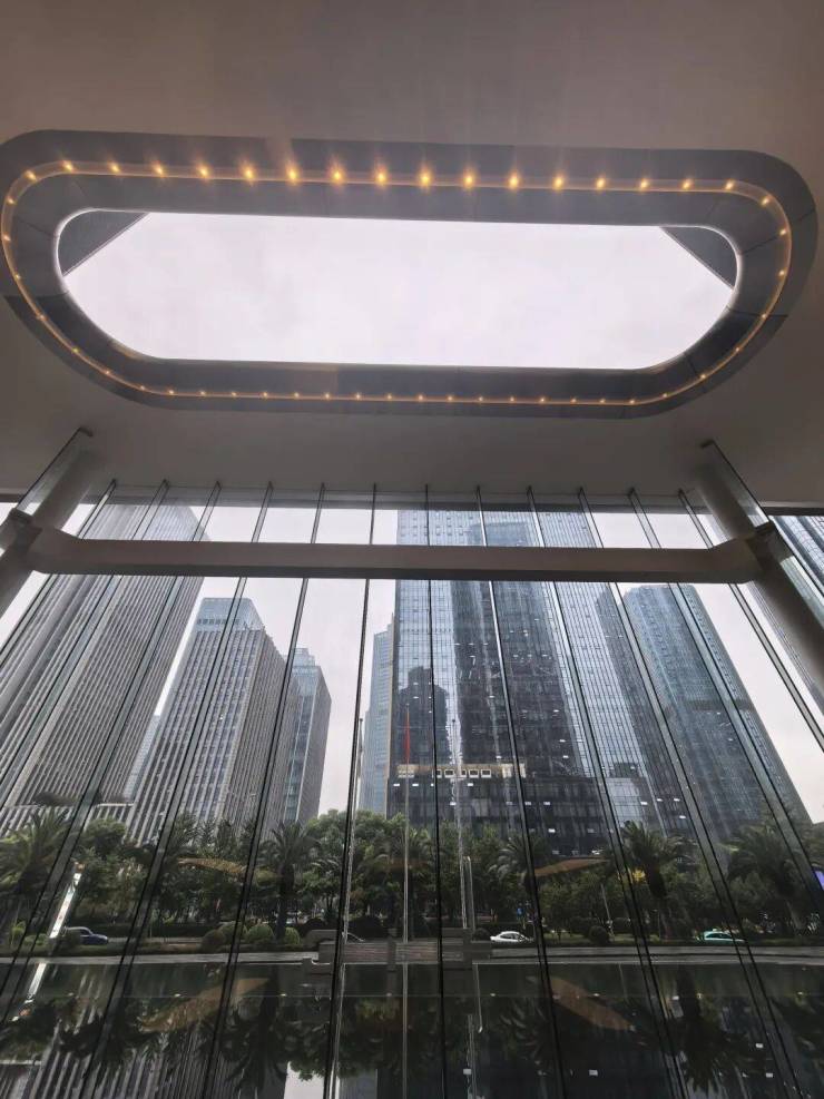 项目其实并没有所谓大门,但每一个大堂确实都令人震撼。18米挑高剧院式大堂,11米高的玻璃立面据说对标苹果旗舰店,还有这个巨大的椭圆形镂空造型,以及像星环轨道一样的灯带,至少在我的印象里,应该是杭州最大气最震撼的大堂!