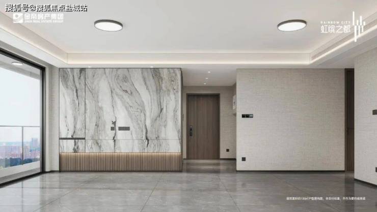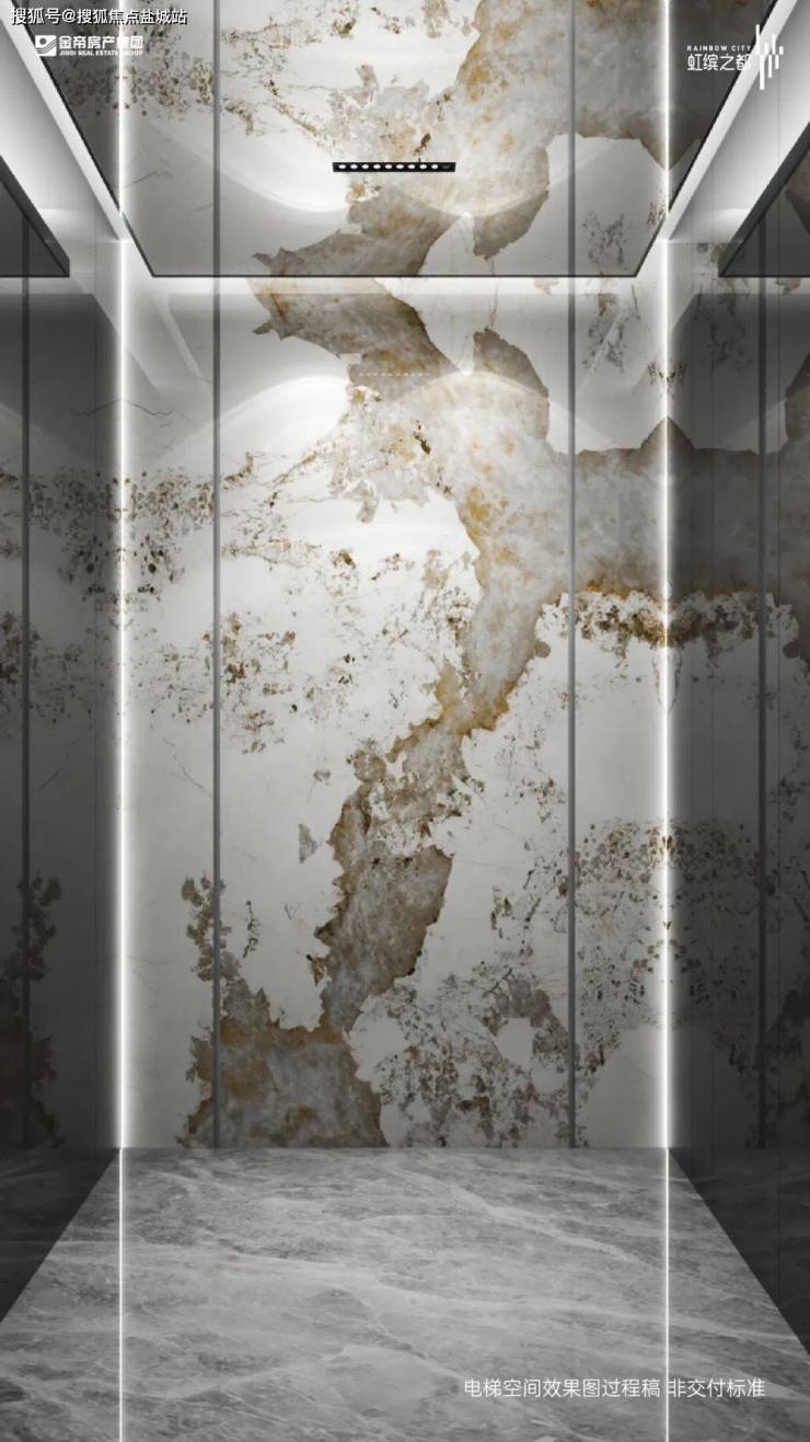 虹缤之都的地下车库是如今在高端楼盘中很流行的“星空顶地库”。单元电梯轿厢也采用岩板装饰,酒店味十足。