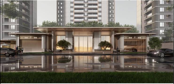 超配迎宾美学:约30m宽迎宾楼与挑高约5.5m酒店式迎宾大堂,以恢弘尺度定义归家高度。