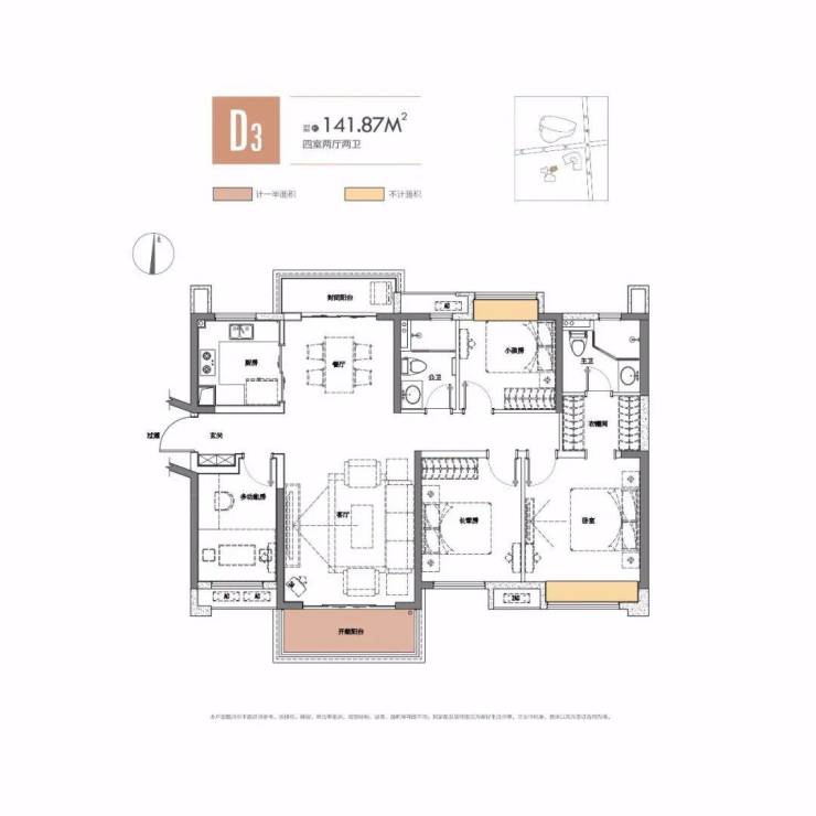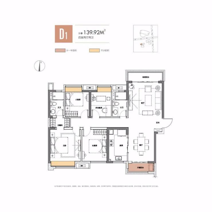 建面约142平户型是标准4房2厅2卫,4开间朝南,对称双阳台,主卧套间面积超大。