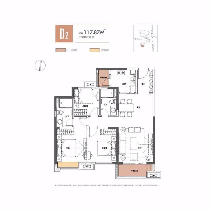 建面约117平户型是标准3房2厅2卫,3开间朝南,南北双阳台,主卧为套间设计,带飘窗。
