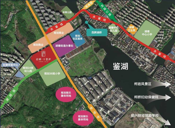 项目北侧规划商业用地3宗,西面邻里中心正在建设中,塔牌绍兴酒厂南侧规划2宗娱乐康体用地;周边鉴湖高尔夫球场、直升机场、浙江国际赛车场等高端娱乐配套环伺