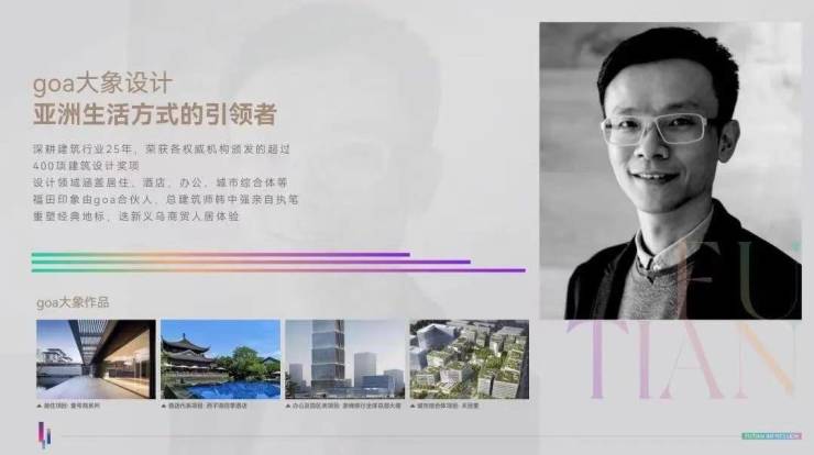 goa大象设计深耕建筑行业25年,荣获各权威机构颁发的超过400项建筑设计奖项。设计领域涵盖居住、酒店、办公、城市综合体等,代表作有壹号院系列、西子湖四季酒店、浙商银行全球总部、杭州天目里、杭州西子国际等,福田印象由goa合伙人,总建筑师韩中强亲自执笔,重塑经典地标,迭新义乌商贸人居体验。