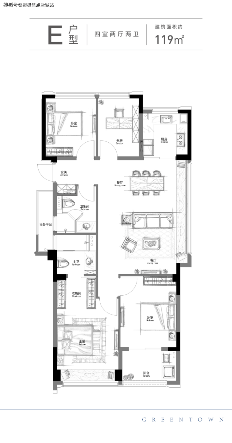 119㎡的大四房户型,以有限的空间,实现无界的居住体验。超大面宽设计,让采光通风更好;四房两厅两卫格局,约6.25米尺度客餐厅,成为先生和太太承载社交会客的重要场所:和三五好友于此谈笑风生,茗茶言欢。
