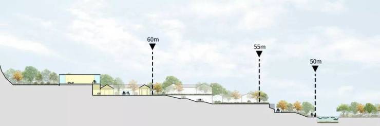 设计师以湖岸、溪谷、茶田、花海搭起的地景结构线,串联起小镇中心、书院以及颐养居住等一系列功能;山地建筑群遵循丘陵起伏、依坡而建 ,形成阶梯式的建筑形态,屋顶层层跌落,消解了建筑的体量感;基地内原有的茶田被保留下来,设计师将茶田作为功能区域的天然的边界,并由此展开新的建造。