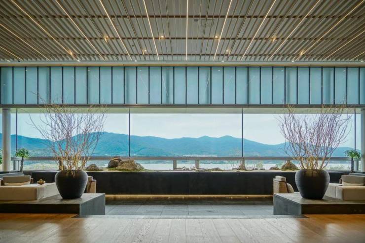 小镇接待中心位于半山,巨幅玻璃窗引山水入画。在此小憩品茗,顿感心旷神怡,胸怀洒落。