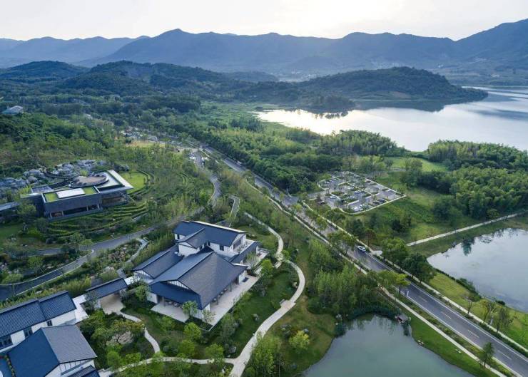 阳羡溪山项目距离宜兴市区仅 10 公里,基地北邻阳羡湖,南依天荒山和西川岭,位于前往大竹海风景区的必经之路上——这样的区位对于旅游产业或城市近郊居所而言十分出众。