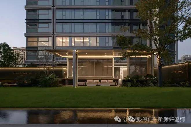 在这般静谧的底色之上,建筑亦褪去冰冷属性,化身艺术臻品。银白色铝板的冷峻质感、大面积玻璃的通透澄澈与深灰线条的利落锋芒完美交织,勾勒出摩登版水墨江南。楼顶如凯旋门般向天舒展,灯塔式塔冠于夜幕中璀璨生辉,纵向线条仿若星河垂落,刚柔并济间,建筑的艺术张力与围合园区的静谧气质相得益彰,为杭城塔尖人士镌刻下永恒的人居传奇。