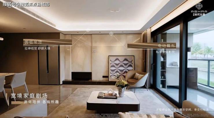 餐客厅弧形吊顶,柔和空间的边界,售楼处电话:400-000-0460转6666更带来视觉的延伸,增强空间的通透感,让空间更显明朗。与主卧配置的智慧灯光系统联动,让光线营造不同场景下的居家氛围感。