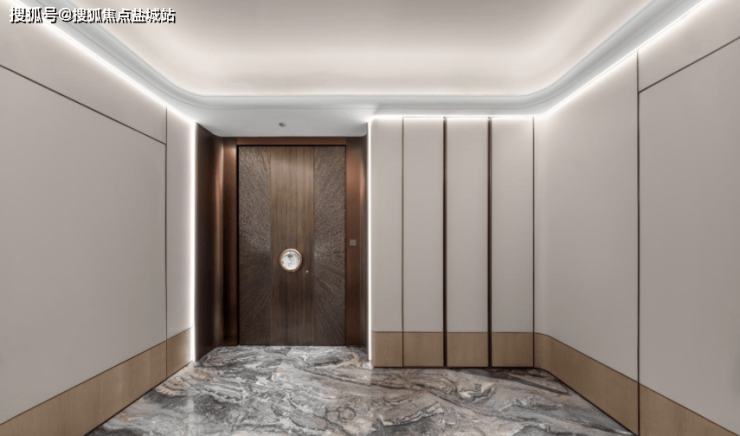 主人由独立电梯直接归家,优雅地推门而入,迎面的十字圆厅玄关,喻意十全十美,不仅仅是一个门厅,更是将生活化为光影舞台的独特空间,对称设计、序列性灯带的辅饰,让回家的每一步都能感受尊崇与庄重的美好。