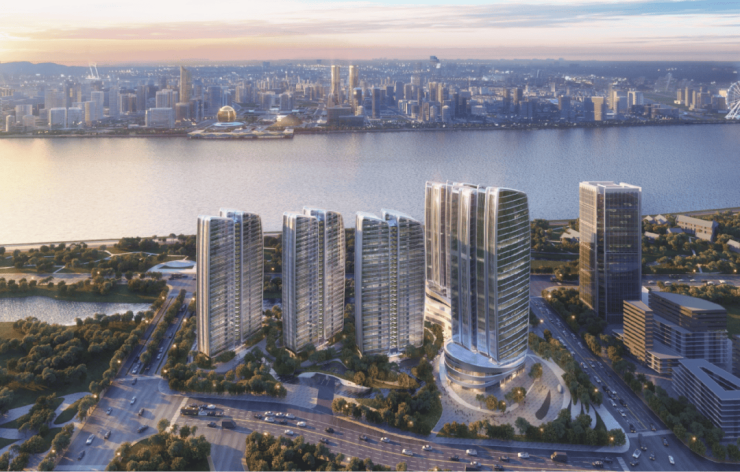 项目占地4.4万方,总建筑面积约33万方,其中地上建筑面积22万方,项目地上最高28层,地下3层,共规划5幢塔楼,由写字楼、大平层公馆和商业三大业态组成。