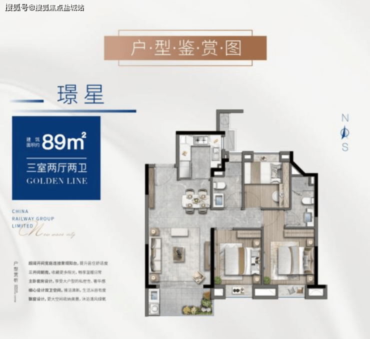 约89㎡的建面即能实现3房功能性还有2卫,主卧实现套房配置,放眼全市性价比都分外突出!格局上做到了三开间朝南,采光效果佳,客餐厨一体化减少动线,对室内面积极致利用!