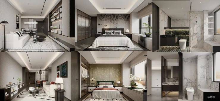 海派拼接:卫生间地面复古拼花、卧室地面人字拼接等元素,与海派的精致优雅相逢。
