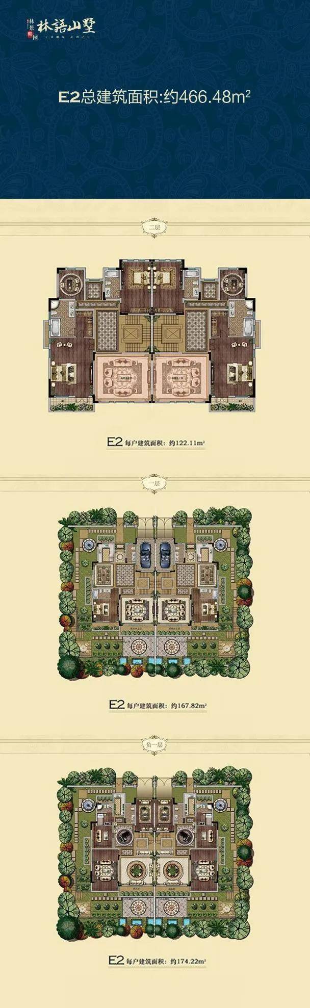 双拼E2户型建面约466㎡,独门独院,地上二层,地下一层。