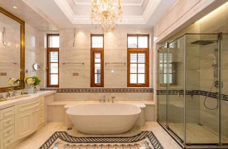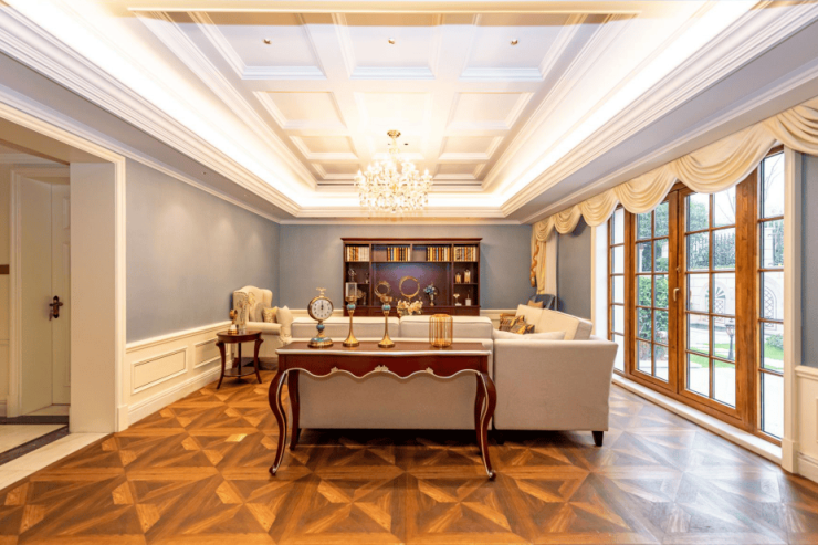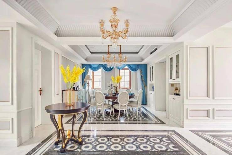 一楼客厅约7.2米挑高设计,恢弘大气。大理石拼花地面精美奢华,超大艺术装饰镜别具一格,优雅的欧式线条与雕花随处可见,整个空间呈现出高贵华丽的格调。