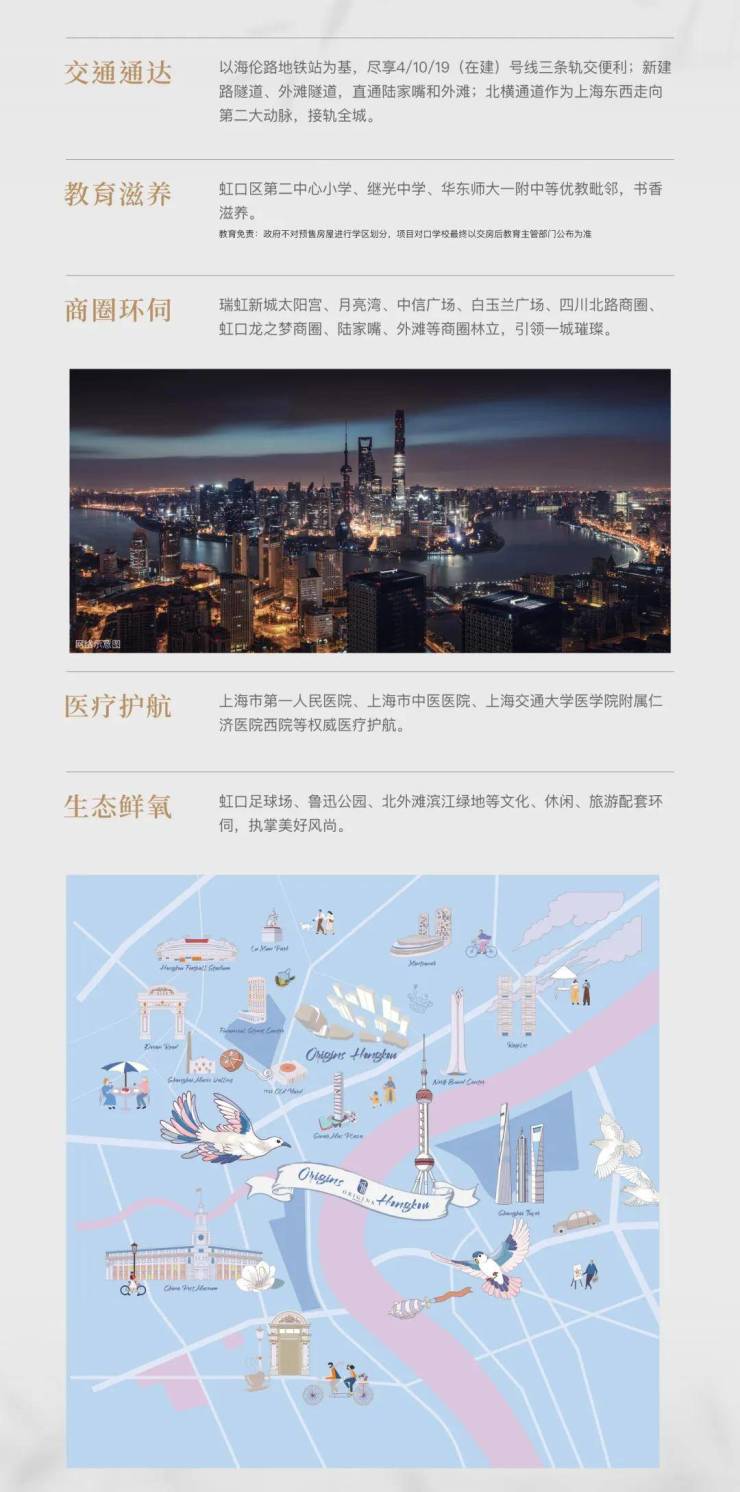 项目自身规划约28万㎡超级综合体,涵盖高端住宅、甲级办公、主题商业等多元业态,下楼即享约4.3万㎡商业配套,与瑞虹天地太阳宫、白玉兰广场形成商圈矩阵。教育资源方面,华师大一附中实验小学、民办新华初级中学等名校环伺,实现从幼儿园到初中的一站式教育覆盖。医疗配套则有上海长海医院、上海市中医医院等三甲医院保驾护航。