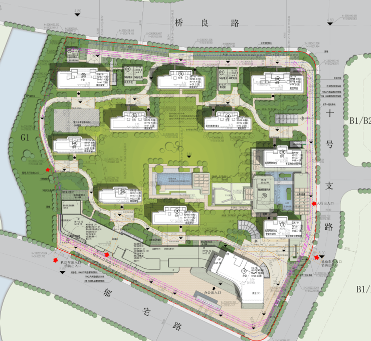 公区规划有下沉式会所、景观水池、主题架空层等配置,主出入口位于小区东侧。