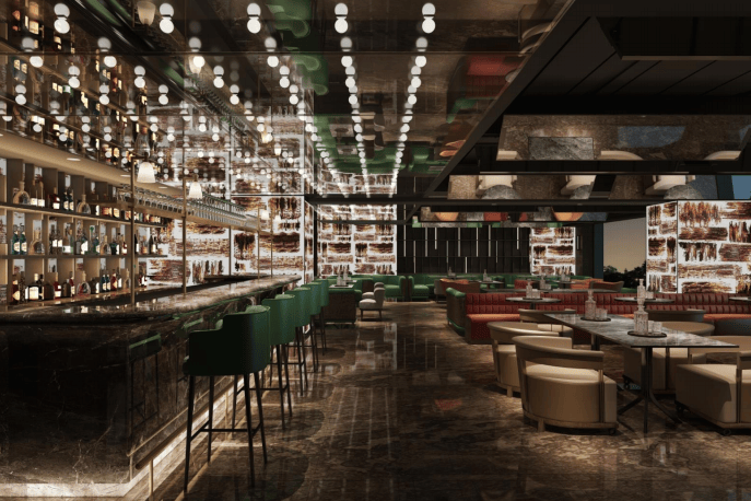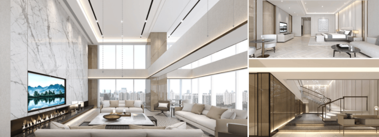 汤臣一品设计师——陈建中担纲设计,采用奢石、艺术马赛克、抽象派画作等元素设计手法搭配高奢撞色艺术家具,营造艺术社交空间。