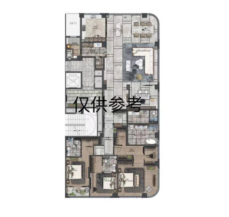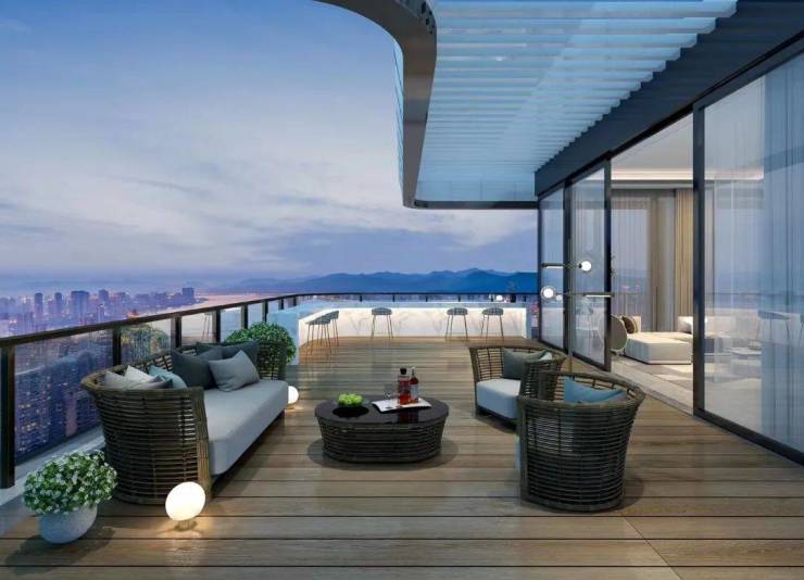 二楼带景观露台,顶楼空间则奢侈到夸张,490m²五房,一层一户送三个露台,比传统的300m²地上三层地下二层的别墅还舒服。因为别墅单层面积80m²,吃个饭楼上楼下跑,这里则是490m²摊在一个平面,因此这类顶楼大平层极度稀缺。