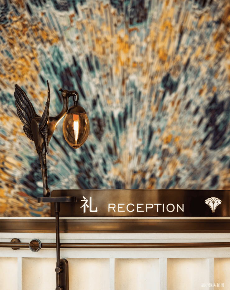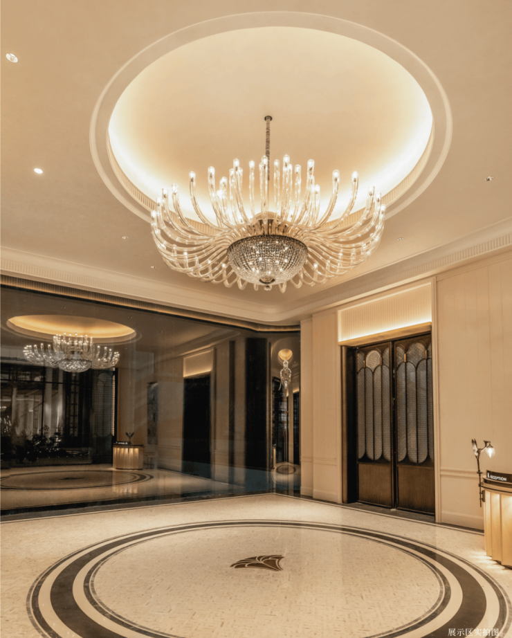 预接待厅门头源于招商局出资创办的原南洋公学(现在上海交大)三段式建筑造型。优美、经典的软装风格定制无不彰显着生活的品味,天花板定制了细腻入微的deco设计细节,地面瓷砖采用威尼斯白与爵士白石材拼花设计,纯人工铺装保证花纹的奢华质感,壁面装饰的水品灯,选用高规格的E9级进口水晶制作,真正将海派设计融入生活。