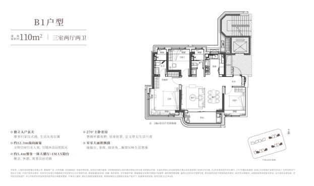 建面约110㎡边套(B1户型),1个宽面阳台、5个飘窗,整体南向面宽做到了约12.3米,大横厅面宽约5.4米,带来超大空间体验和充足通风采光。更为难得的是,该户型标配了全屋飘窗,主卧更是拥有270°转角飘窗,拓宽室内景观视野的同时,增加了实际空间使用率,加上三玻两腔系统窗隔音,在欣赏窗外景色的同时,也不会被噪音打扰。建面约110㎡中间套(B2户型),也同样做到了南北通透,三开间朝南,洄游动线,布局合理,无论是空间尺度还是通风采光,与边套享受一样的品质感!