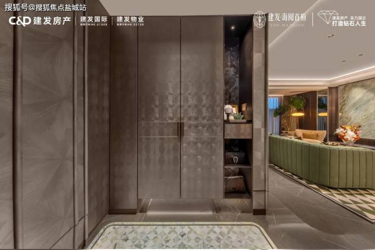 地面拼花沿用了 海派风格的黑白拼接精髓!用料也极为考究!玄关柜的中间镶嵌了 蓝翡翠岩板,提升了整体进门的质感,柜体的面层采用了咖色纹理皮革设计!单是这个玄关,就尽显项目品质和品味!