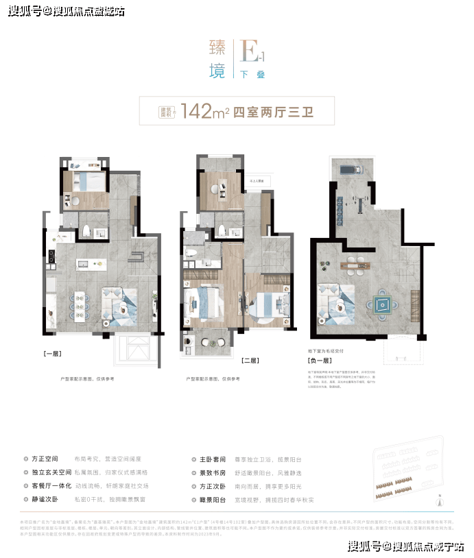 下叠户型四室两厅三卫,是金地嘉境的明星之作。地上一层,以中轴线精心划分,开放而方正,南北通透,宽景落地窗让阳光自由洒落,为家庭聚餐和亲友聚会提供了一个明亮而舒适的社交场所。南向的独立书房,不仅提供了静谧的办公环境,更将四季变换的美景尽收眼底。而负一层的多功能空间,可根据每位家庭成员的爱好,自由改造,成为个性化的私属领地。