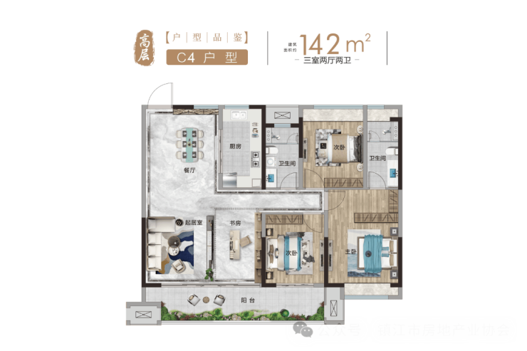 空间布局:客餐厅连接南向宽景阳台,视野开阔,可俯瞰社区园林景观;双卫生间均为全明设计,避免早晚使用高峰拥堵;书房空间灵活,可根据需求改造为茶室、儿童游乐区,适配家庭不同阶段的生活需求。