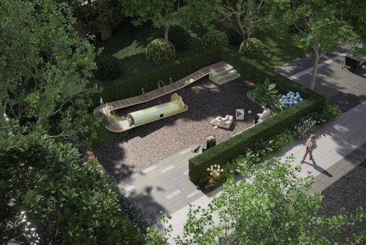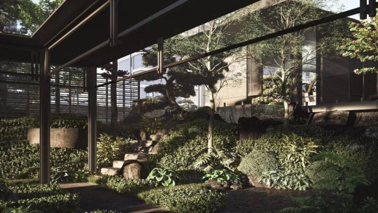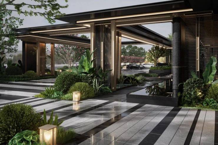 奉化首个超2000方下沉式庭院,结合园区入口会所设计,面向庭院的立面设计通透的大面积玻璃幕墙,让室内外相互交融,为地下空间引入自然采光和通风营造出具有层次感的空间场景,为住户带来极致的度假体验。