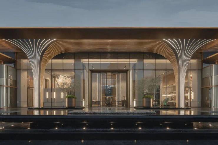 高净值人群对“隐奢、效率、艺术”的复合诉求越来越高,我们需要设计足够好的空间去将理想的生活场景逐步装载进未来的生活。首先展现圈层归属感的:酒店式归家门厅,9米高古铜森林大门,设计灵感源于第一次到文化公园里考察场地看到的自然的森林,我们用古铜不锈钢塑造了这座艺术之门,如树木般生机勃勃,不断发展向好的寓意。