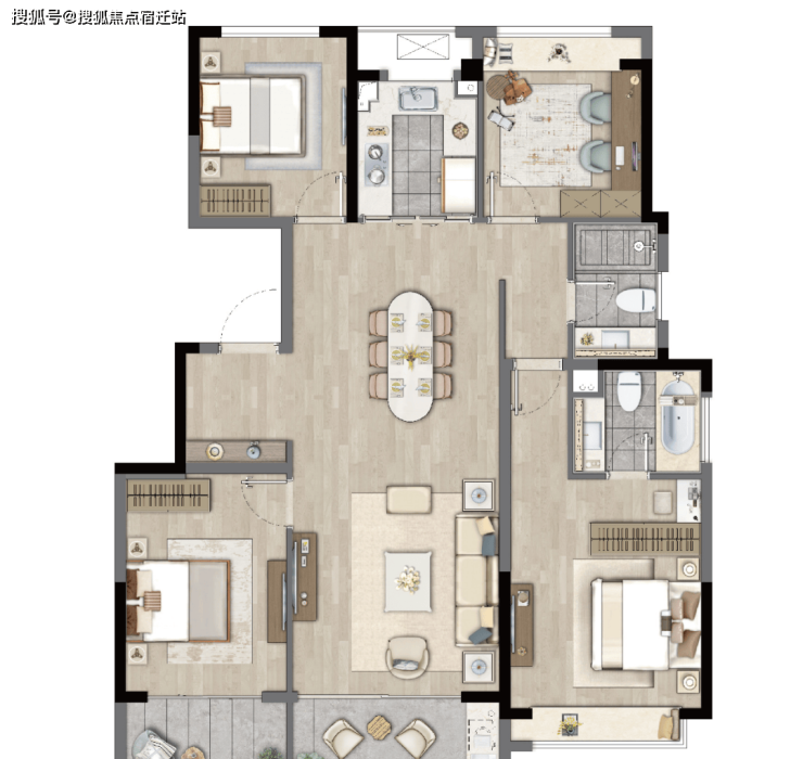 实体样板间为9#楼204(工程栋号)。该户型为四叶草户型,入户有独立玄关,餐客厅空间一体,南向约7米阳台,主卧套房设计,配备宽景飘窗、独立卫浴。
