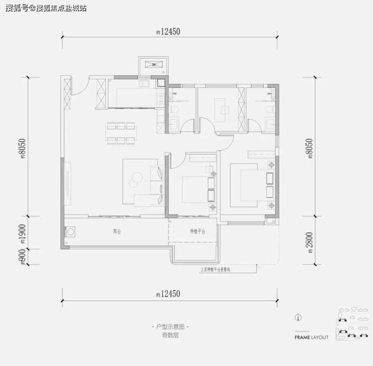 就拿建面约128㎡三室两厅两卫(A2)户型来说,南向面宽约12.45米,三开间朝南,南北通透,全明,动静分离。
