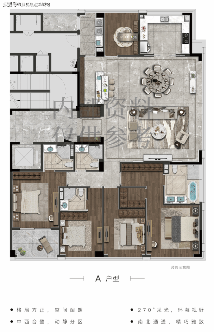 320m²做了3个户型3种风格任选,四房和五房满足不同的需求,得房率78%,大方厅的尺度极其阔绰,宽U型的厨房非常明亮。围合原生因此户型可以做得很出彩。