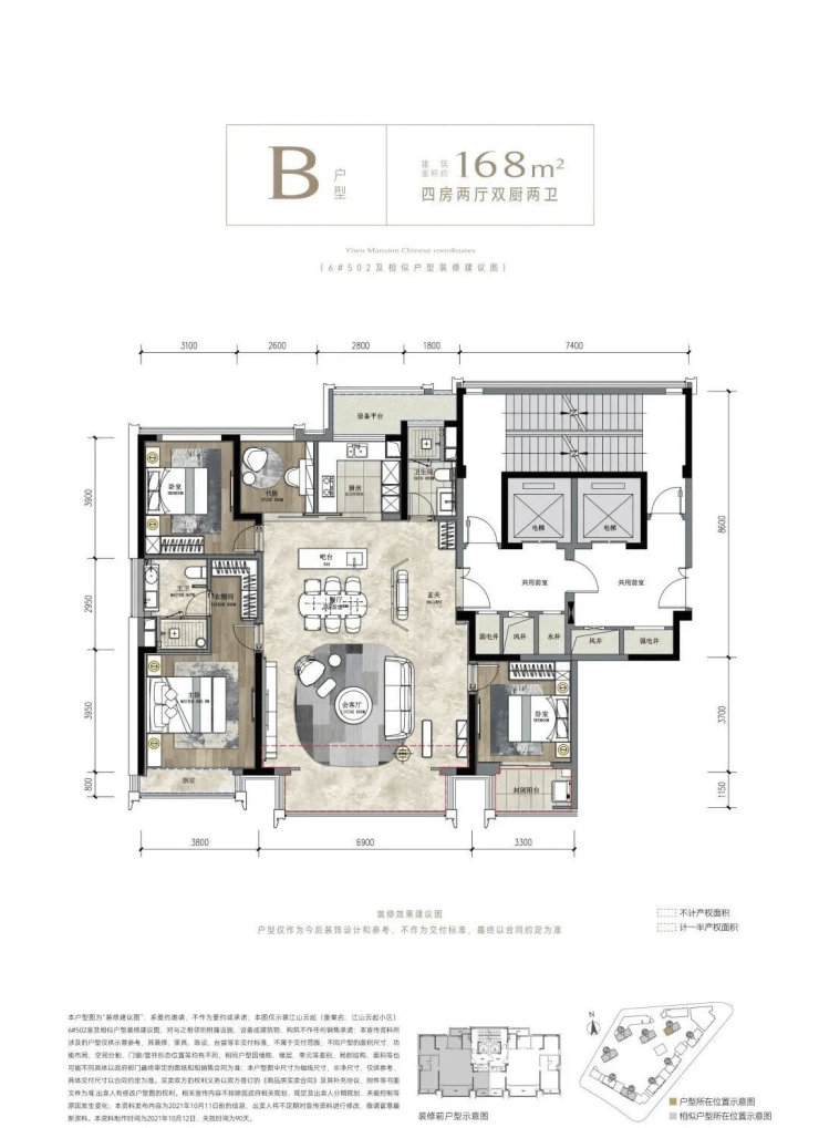 3、在售户型:168平 四室两厅两卫 一梯一户精装修交付