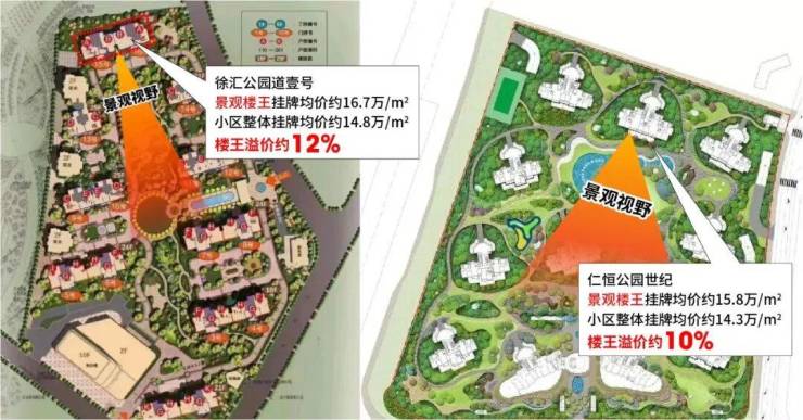 · 徐汇的公园道壹号项目,整盘的挂牌均价大概在14.8万/㎡,景观视野无敌的楼王楼栋挂牌均价要16.7万/㎡,楼王溢价约12%。