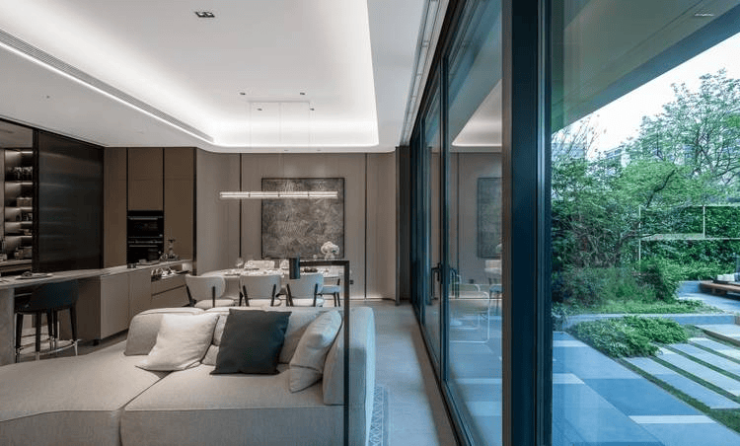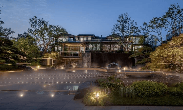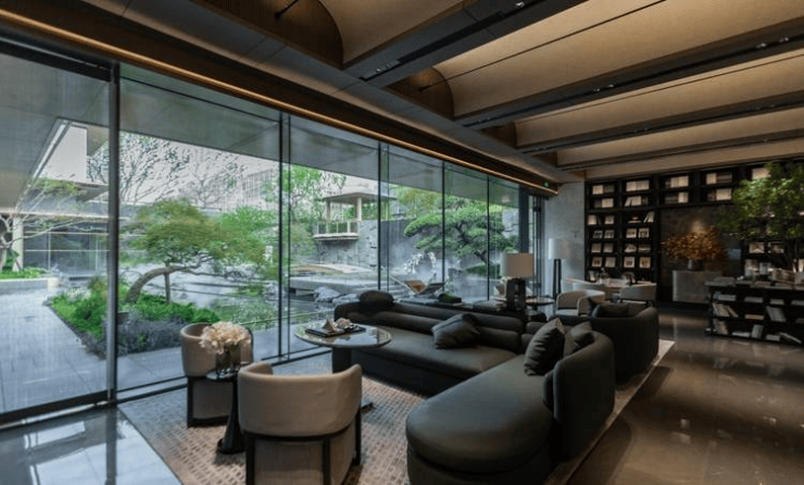 大尺度巨幕玻璃窗镶嵌金色铝线条,极简化打造光影天幕,倒映自然之境;臻选靛蓝色的陶瓦,原创蓝金坡屋顶,掀起杭州合院立面的新序章。黑金砂石造境 归家即是入境宋画巧借坡地起伏的地形高差,樾青岚将整座美学馆进行缓坡处理,让归家犹如一次轻松写意的“登山”之旅。